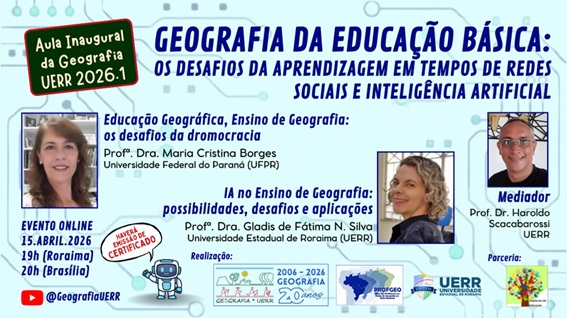 O curso de Geografia da Universidade Estadual de Roraima (UERR), em comemoração aos seus 20 anos de criação, realizará uma aula inaugural especial com o tema: “Geografia da Educação Básica: desafios da aprendizagem em tempos de redes sociais e IA”. O evento será on-line, no dia 15 de abril, às 19h, no link: https://www.youtube.com/watch?v=WsfqTnUNWkk.