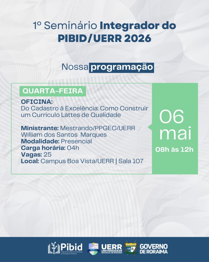 Se você quer elevar o nível do seu Currículo Lattes e se destacar na vida acadêmica, essa é a oportunidade certa. Participe da oficina no 1º Seminário Integrador do PIBID/UERR 2026!