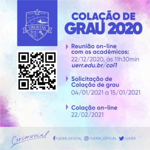 A Universidade Estadual de Roraima informa que foram definidas as datas para solicitação e cerimônia de colação de grau dos concluintes de 2020. – Reunião on-line com os concluintes: 22/12/2020, às 11h30, através do link uerr.edu.br/col1 – Solicitação de colação de grau: 04/01/2021 a 15/01/2021 – Cerimônia on-line: 22/02/2021 Todos os informes e detalhes serão