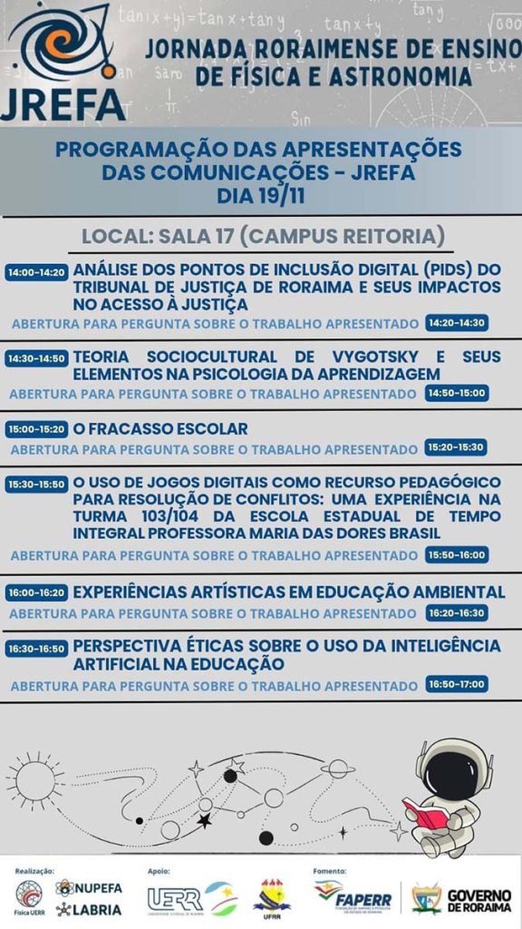 As inscrições estão abertas no link: https://www.even3.com.br/jornada-roraimense-de-ensino-de-fisica-e-astronomia-616645/