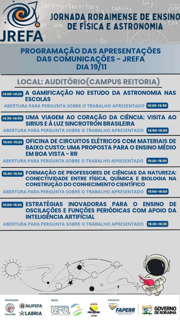 A Universidade Estadual de Roraima (UERR) realiza, entre os dias 17 a 19 de novembro de 2025, a Jornada Roraimense de Ensino de Física e Astronomia (JREFA), o evento reúne pesquisadores, professores da educação básica, licenciandos e gestores educacionais em torno do debate sobre Ensino de Ciências, especialmente Física e Astronomia, na Amazônia.