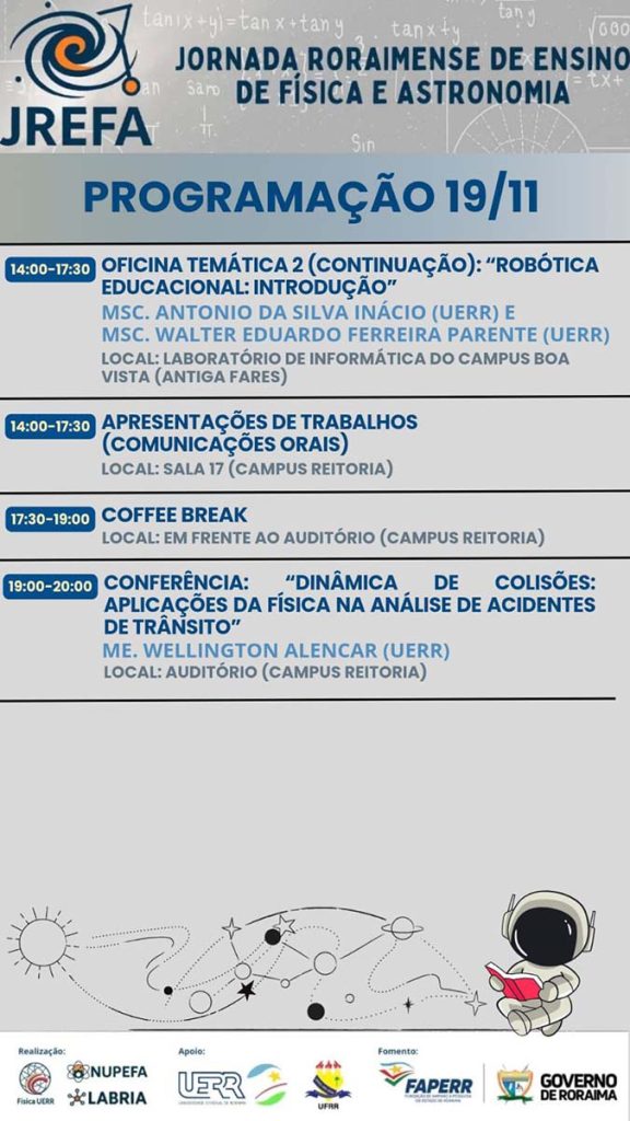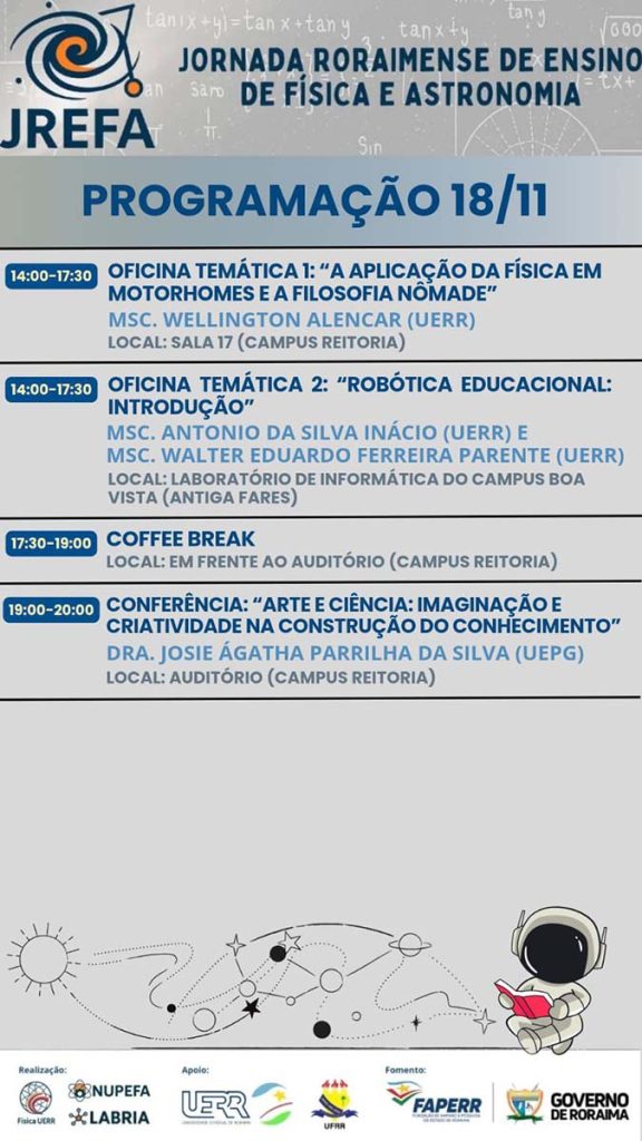 Com atividades presenciais nos Campi Boa Vista e Célia Maria Magalhães Nobre, a Jornada é organizada pelo Curso de Física da UERR em parceria com o “Núcleo de Pesquisas em Engenharia, Física e Astrofísica” (NUPEFA) e o “Laboratório de Automação, Robótica e Inteligência Artificial” (LABRIA). A coordenação geral é do professor Elemar Kleber Favreto (UERR) e da professora Juliana Cristina Sousa da Silva (Avancei).