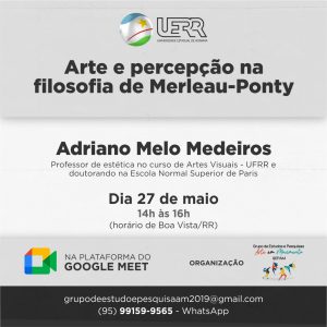 Nesta quinta-feira, 27, a partir das 14 horas, o Grupo de Estudos e Pesquisas Arte em Movimento, que faz parte do curso de Educação Física da UERR (Universidade Estadual de Roraima), vai promover a palestra “Arte e percepção na filosofia de Merleau-Ponty”. A programação faz parte de uma agenda desenvolvida sempre na última quinta-feira de cada mês.