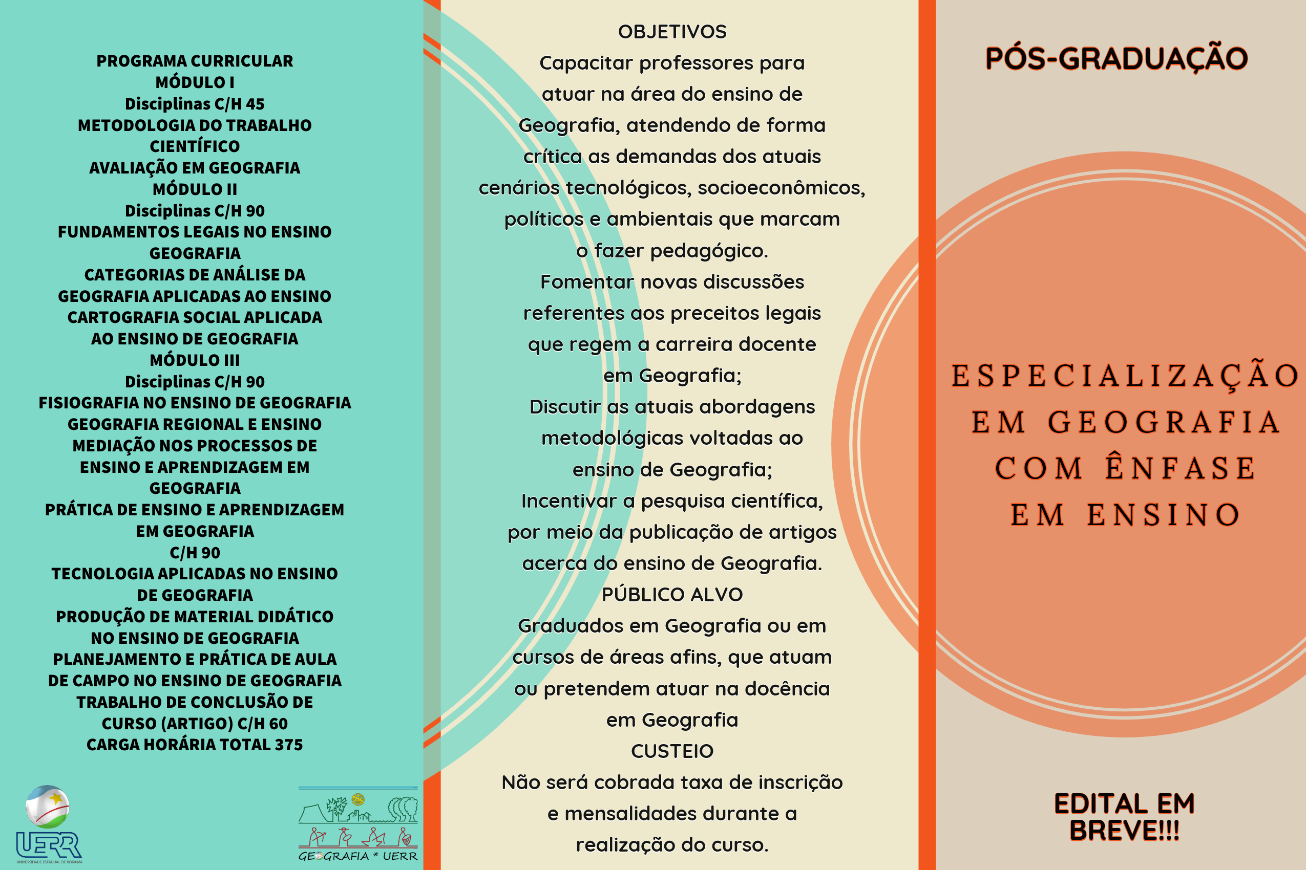 Colegiado: O corpo docente do curso é integrado por professores pesquisadores doutores e mestres, com experiência no ensino superior e na educação básica, formados em instituições respeitadas nacionalmente, que atuam tanto na Licenciatura em Geografia quando nos programas de pós-graduação lato sensu e stricto sensu da UERR.