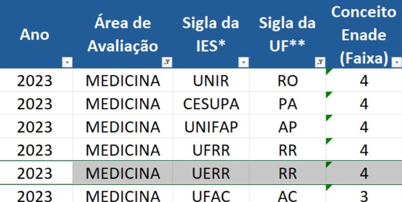 Os cursos de Medicina e Enfermagem da Universidade Estadual de Roraima (UERR) alcançaram nota 4 no Enade (Exame Nacional de Desempenho dos Estudantes), avaliação feita em todo o país pelo Instituto Nacional de Estudos e Pesquisas Educacionais Anísio Teixeira (Inep), que é vinculado ao Ministério da Educação (MEC).