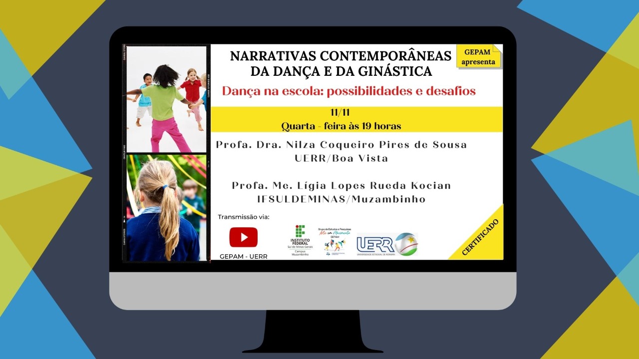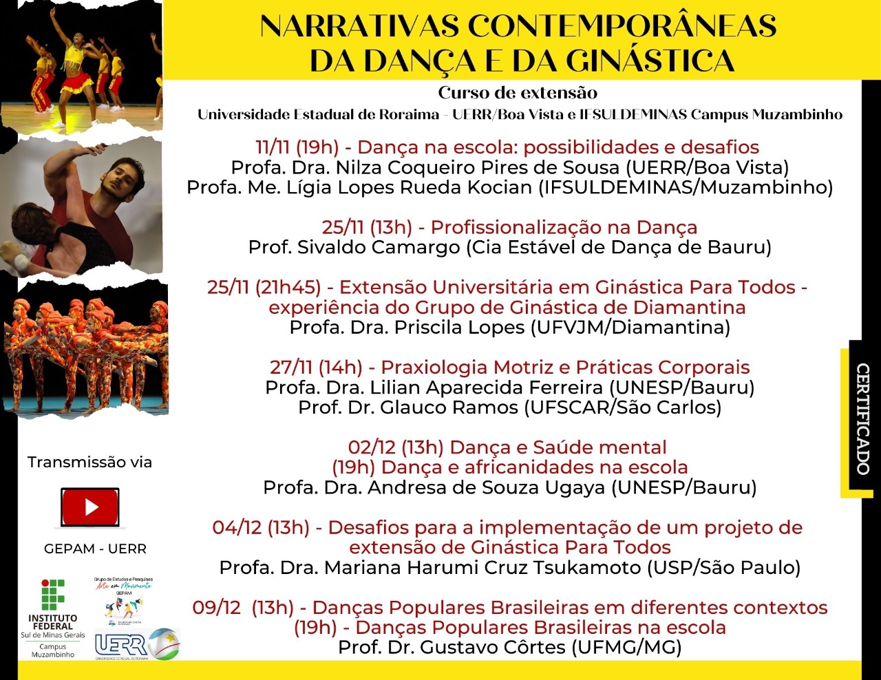 Nos meses de novembro e dezembro será realizada uma série de lives, através do canal do Youtube GEPAM-UERR, com a temática Narrativas contemporâneas da Dança e da Ginástica. O projeto de extensão tem como objetivo proporcionar uma reflexão sobre os temas emergentes da Educação Física, no tocante à dança e ginástica, por meio de uma concepção pedagógica, educativa, social e cultural do ser humano.