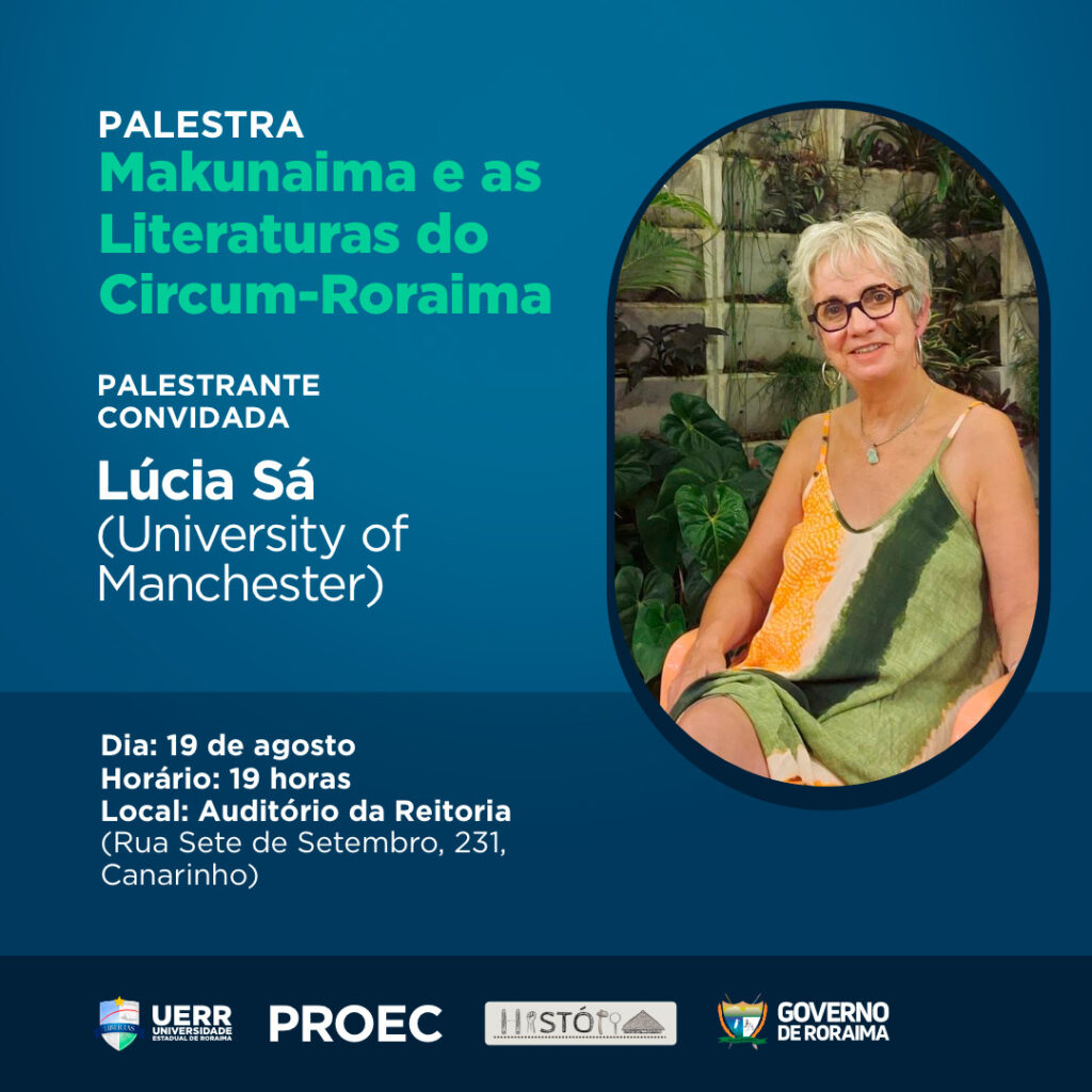 No próximo dia 19 de agosto, segunda-feira, a Universidade Estadual de Roraima (UERR) vai realizar a palestra “Makunaima e as Literaturas do Circum-Roraima” no Auditório Professor Amarildo Nogueira Batista, localizado no Campus Reitoria (Rua Sete de Setembro, 231, Canarinho).