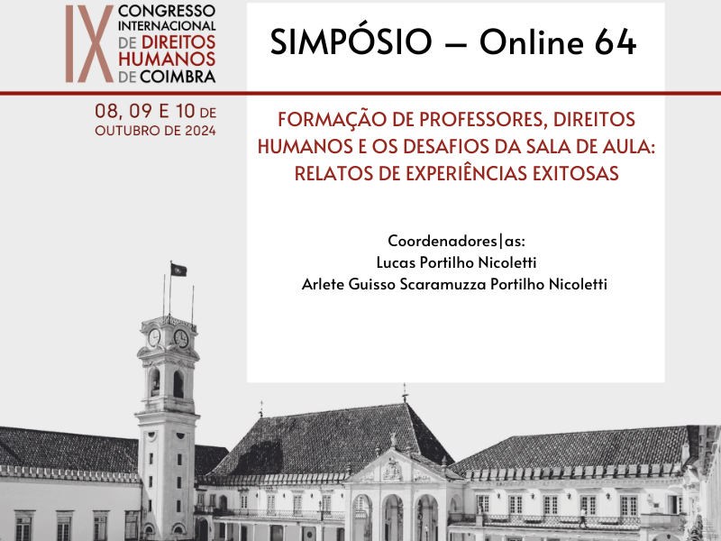 O Prof. Dr. do Mestrado em Educação da Universidade Estadual de Roraima (UERR), Lucas Portilho Nicoletti, é coordenador de um dos simpósios do IX Congresso Internacional de Direitos Humanos de Coimbra – Uma Visão Interdisciplinar, evento organizado pela Universidade de Coimbra (Portugal) em parceria com o Instituto Nacional de Pesquisa e Promoção de Direitos Humanos (Brasil), que ocorrerá entre os dias 08 e 10 de outubro. A atividade será realizada em parceria com a Profa. M. Arlete Guisso Scaramuzza, do Grupo de Estudos e Pesquisas PAIDEIA (UNICAMP).