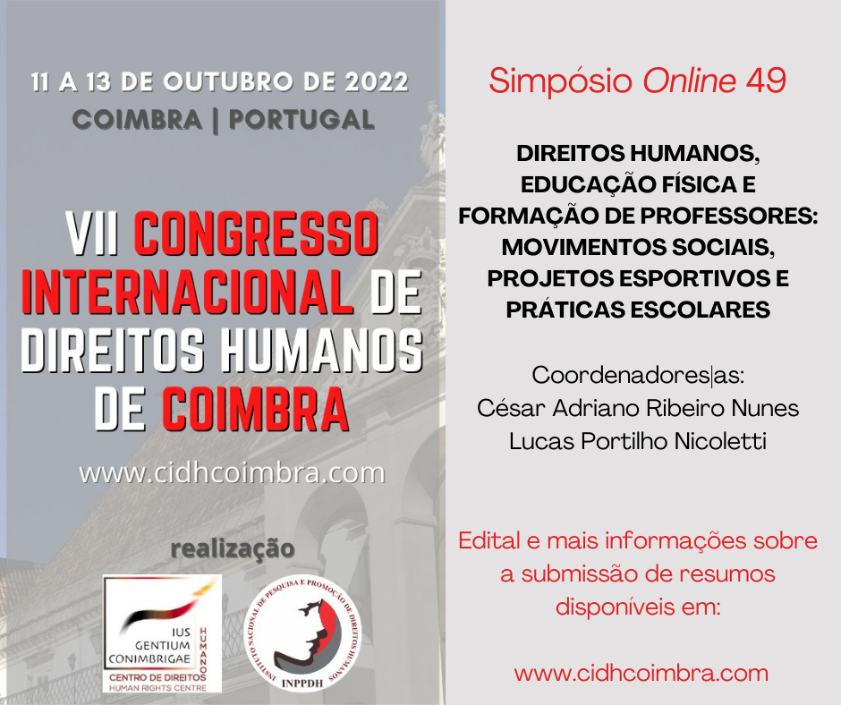 Lucas Portilho Nicoletti, professor do curso de Educação Física da Universidade Estadual de Roraima (UERR), está coordenando uma das atividades do VII Congresso Internacional de Direitos Humanos de Coimbra, evento que vai ocorrer na Universidade de Coimbra, em Portugal, de 11 a 13 de outubro. O edital para submissão de resumos está disponível no site www.cidhcoimbra.com.