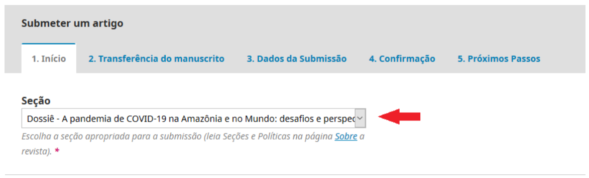Na hora da submissão os autores devem escolher o Dossiê “A pandemia de Covid-19 na Amazônia e no mundo: desafios e perspectivas”, conforme imagem abaixo: