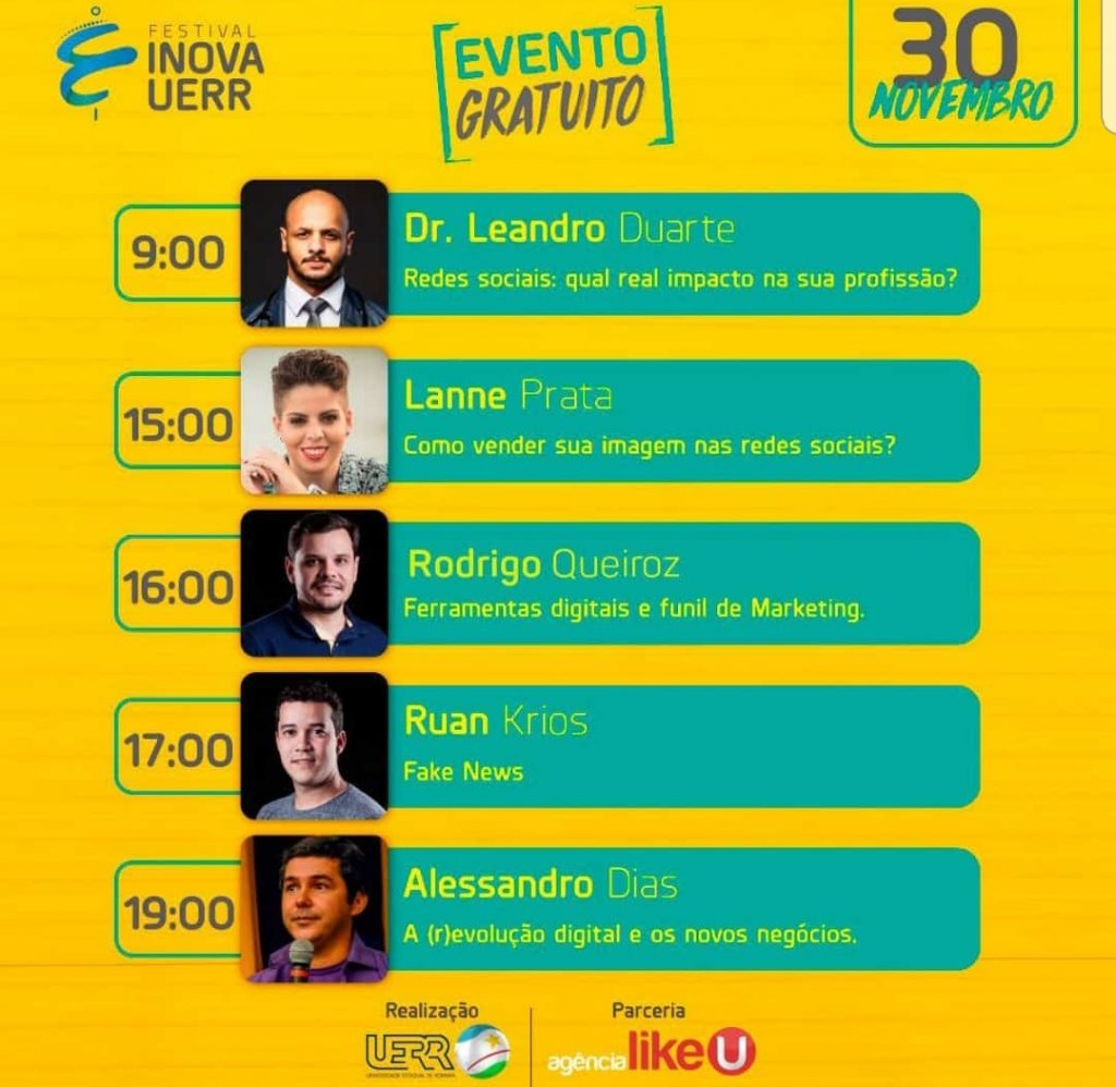 No dia 30, às 9 horas, no auditório do Campus Boa Vista, terá início a palestra sobre redes sociais “qual real impacto na sua profissão?”, com Leandro Duarte. Às 15 horas será a palestra com Lanne Prata sobre “como vender sua imagem nas redes sociais?”; Às 16 horas, Rodrigo Queiroz falará sobre as “ferramentas digitais e o funil de marketing”; Ruan Krios falará sobre fake news às 17 horas; e Alessandro Dias, às 19 horas, falará sobre “A (r)evolução digital e os novos negócios”.