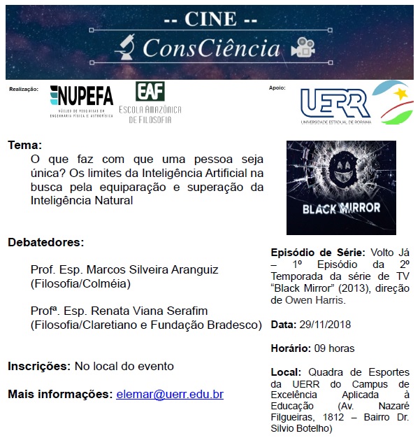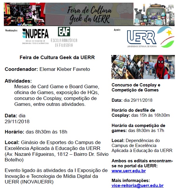 Nas salas 1 e 2 e no pátio do Campus acontecerão: Campeonato de E-Sports promovido pelo curso de Bacharelado em Ciências da Computação da UERR. Já o Programa Cine ConsCiência fará a apresentação de episódio da série Black Mirror. O Núcleo de Pesquisa em Engenharia Física e Astrofísica (NUPEFA / UERR), realizará lançamento de foguetes e Swordplay – Coordenado por Geek Pappelassoios e Kuroi Hunter, com simulação de batalha medieval.