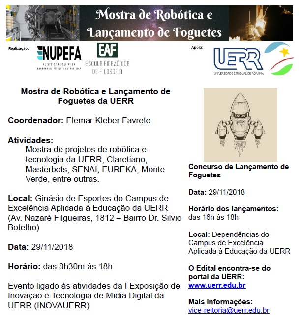 A Universidade Estadual de Roraima realizará nos dias 29 e 30 de novembro, em parceria com a agência LikeU, um dos maiores eventos de tecnologia e empreendedorismo universitário do Estado. O Festival Inova UERR acontecerá nos campi: de Excelência Aplicada à Educação (Sílvio Botelho) e no Boa Vista (Canarinho). A entrada é gratuita e aberta ao público.