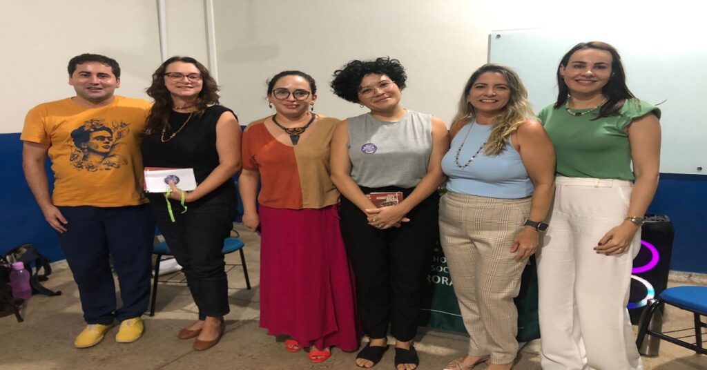 Prof. José Filho Araújo, assistente social Luziene Parnaíba, Profa Rita de Cássia Barbosa (coordenadora do projeto de extensão), assistente social Catarina Betel (TJRR), Profa Hanriqueta Alencar (coordenadora do curso de Serviço Social da UERR) e Profa Janaine Voltoline.